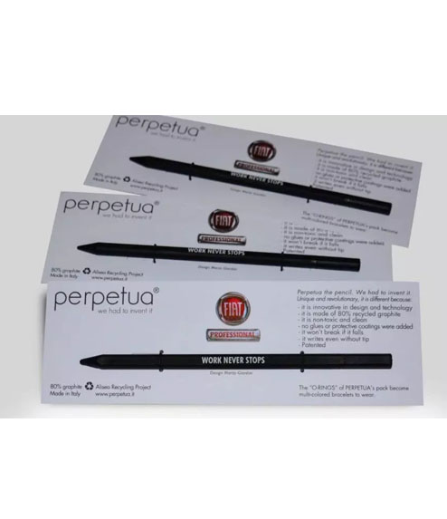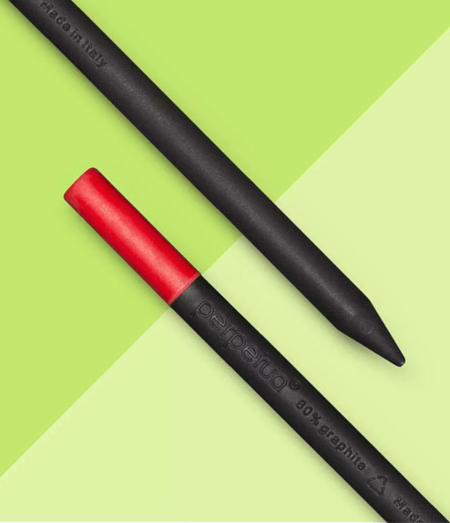 No se corta ningún árbol para producirlo. Diferente a todos los demás porque está hecho en un 80% con polvo de grafito reciclado que, gracias a la adición de un aglutinante especial, adquiere dureza. No mancha las manos y, si se cae, no se rompe. Se puede afilar, pero también escribe sin punta o si se corta en partes. Quien usa Perpetua el lápiz recicla escribiendo 15 gr de grafito que de otro modo habrían acabado en el vertedero, bajo tierra. Diseño Marta Giardini, Mención de Honor Compasso d’Oro. Es el único lápiz producido en Italia: 100% Hecho en Italia
